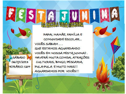 - O evento (nossa festa junina) se realizará dia 06/07/2013 (sábado);